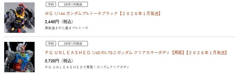 ここでは、2025年11月〜2026年初頭にかけて再販予定とされている人気キットを例として紹介します。