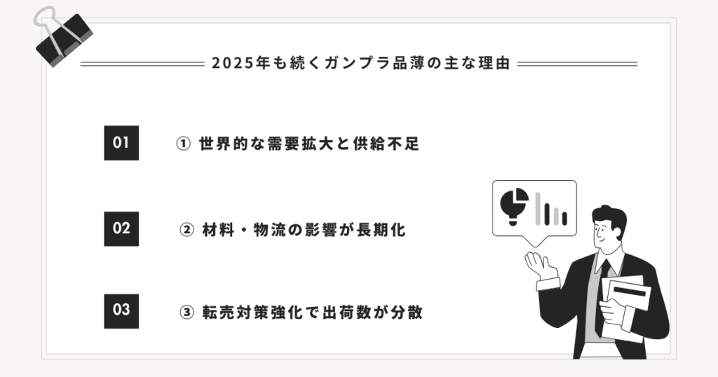 この章では、なぜ2025年になってもガンプラが手に入りにくいのか、現在の供給状況をもとに主な理由をわかりやすく解説します。
