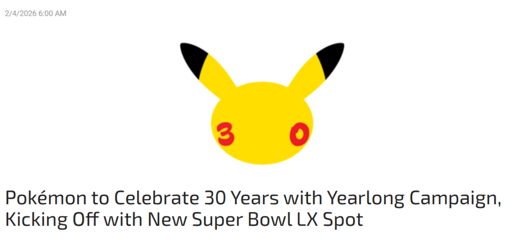Airing Feb. 8, 2026, the Super Bowl spot will illustrate the brand’s mission to bring people together through a shared love of Pokémon and honor its growing audience of diverse, global and multigenerational fans across three decades.
